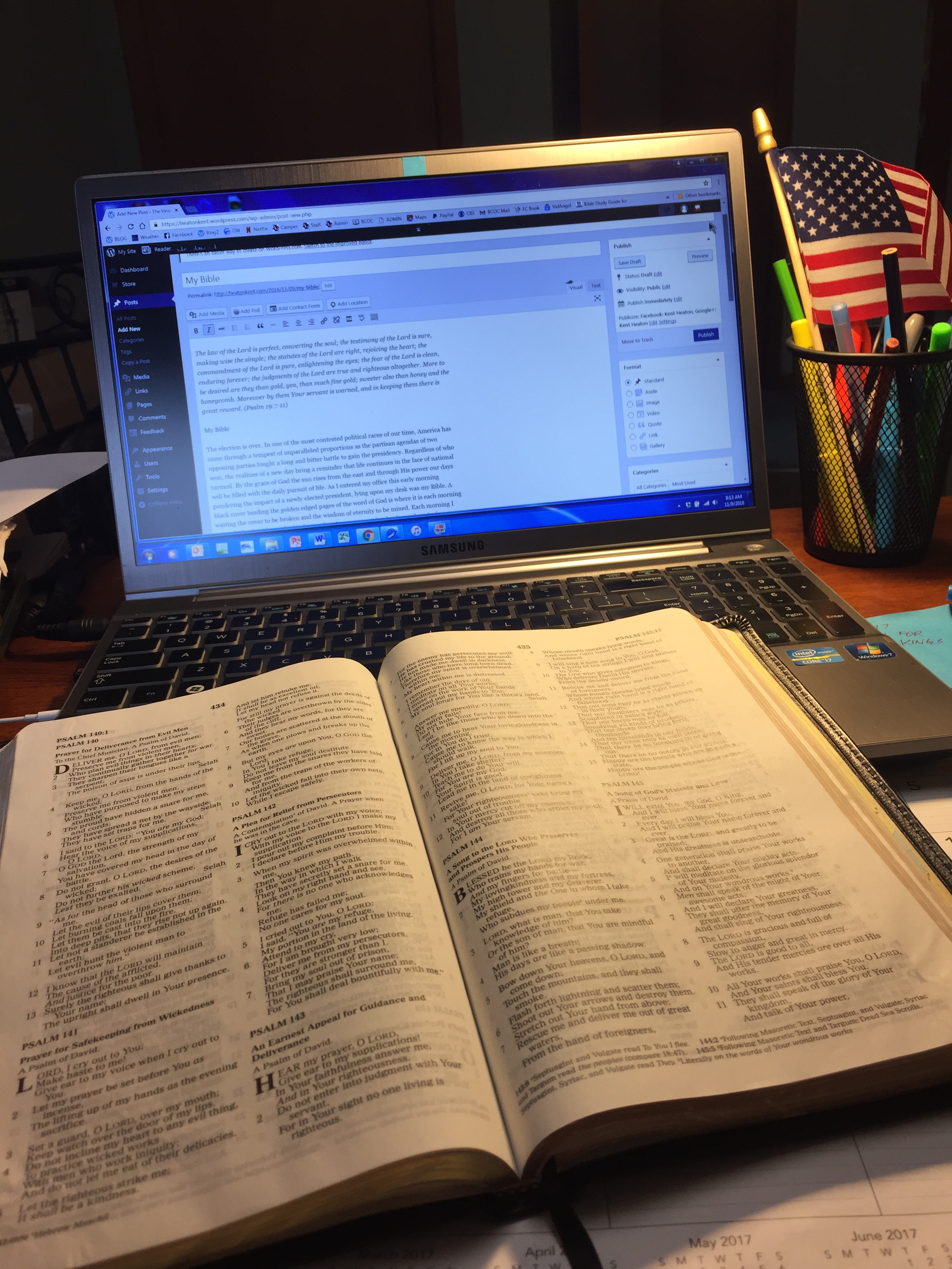 The past year has been a flurry of political intrigue filling every part of the conversation of life. There is an immense sense of relief the year of electing another president is over. This one especially. It is great to be an American but this has not been a stellar year for the American spirit. Through all of the anguish of fear and doubt, my Bible has remained constant waiting for me each day on my desk. This morning was no different than any morning with the exception that I was really glad to see my Bible this morning. A constant friend and an abiding companion, my Bible is a refreshing breath of real hope filling my mind – not with the putridity of human waste – but the glory of God and His love. Rising above the debauchery of a world filled with prejudice and hatred, the oasis of the mind of God brings relief and soothes the soul.