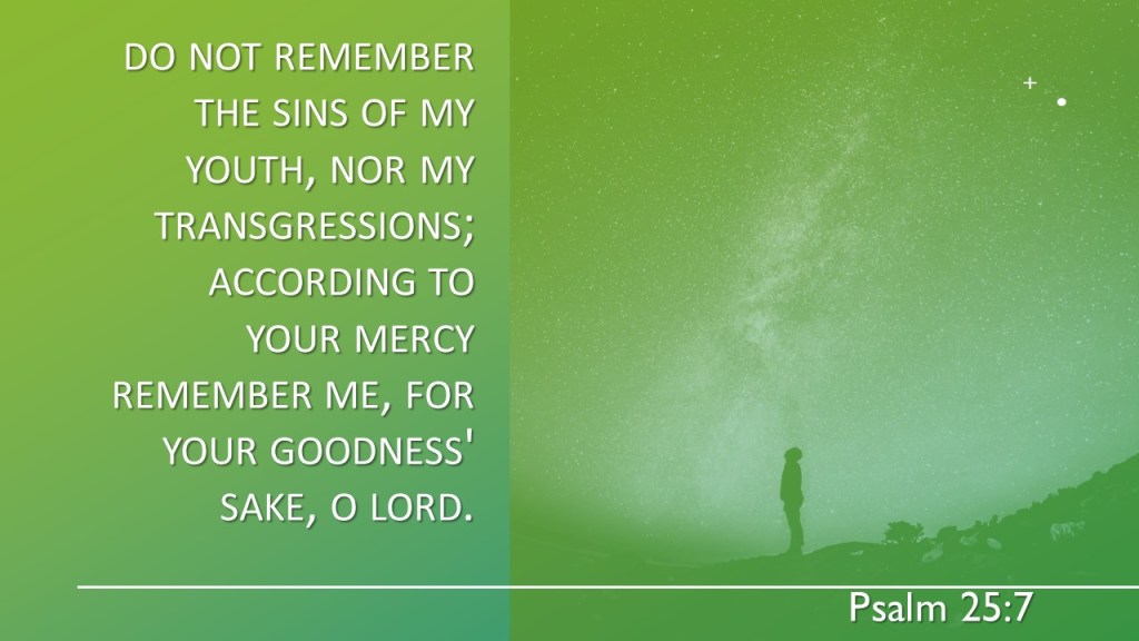 Remember, O Lord, Your tender mercies and Your lovingkindnesses, for they are from of old. Do not remember the sins of my youth, nor my transgressions; according to Your mercy remember me, for Your goodness’ sake, O Lord. (Psalm 25:6-7)