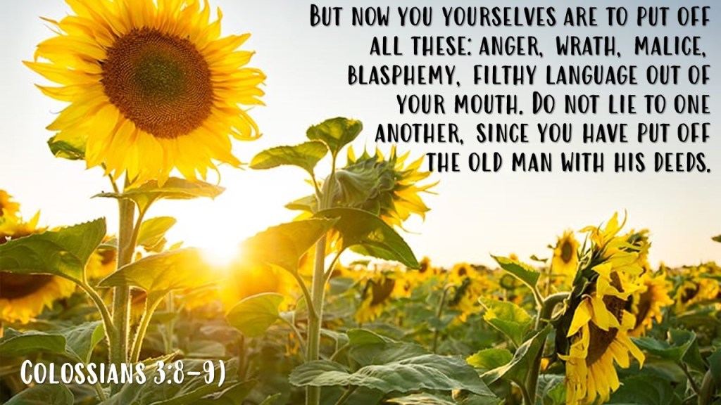 But now you yourselves are to put off all these: anger, wrath, malice, blasphemy, filthy language out of your mouth. Do not lie to one another. (Colossians 3:8-9a)