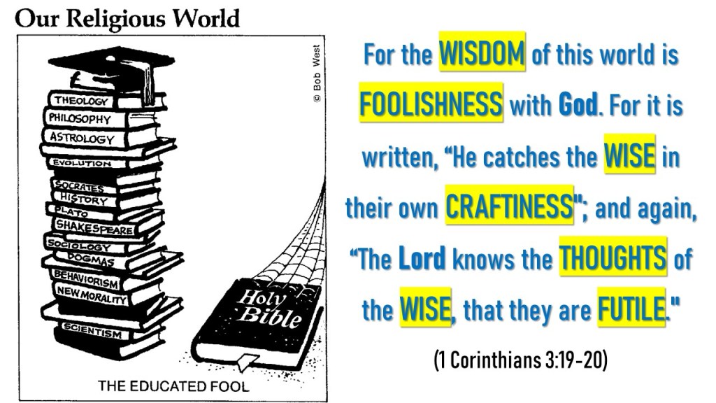 Let no one deceive himself. If anyone among you seems to be wise in this age, let him become a fool that he may become wise. For the wisdom of this world is foolishness with God. For it is written, “He catches the wise in their own craftiness”; and again, “The Lord knows the thoughts of the wise, that they are futile.” Therefore let no one boast in men. For all things are yours: whether Paul or Apollos or Cephas, or the world or life or death, or things present or things to come—all are yours. And you are Christ’s, and Christ is God’s. (1 Corinthians 3:18-23)