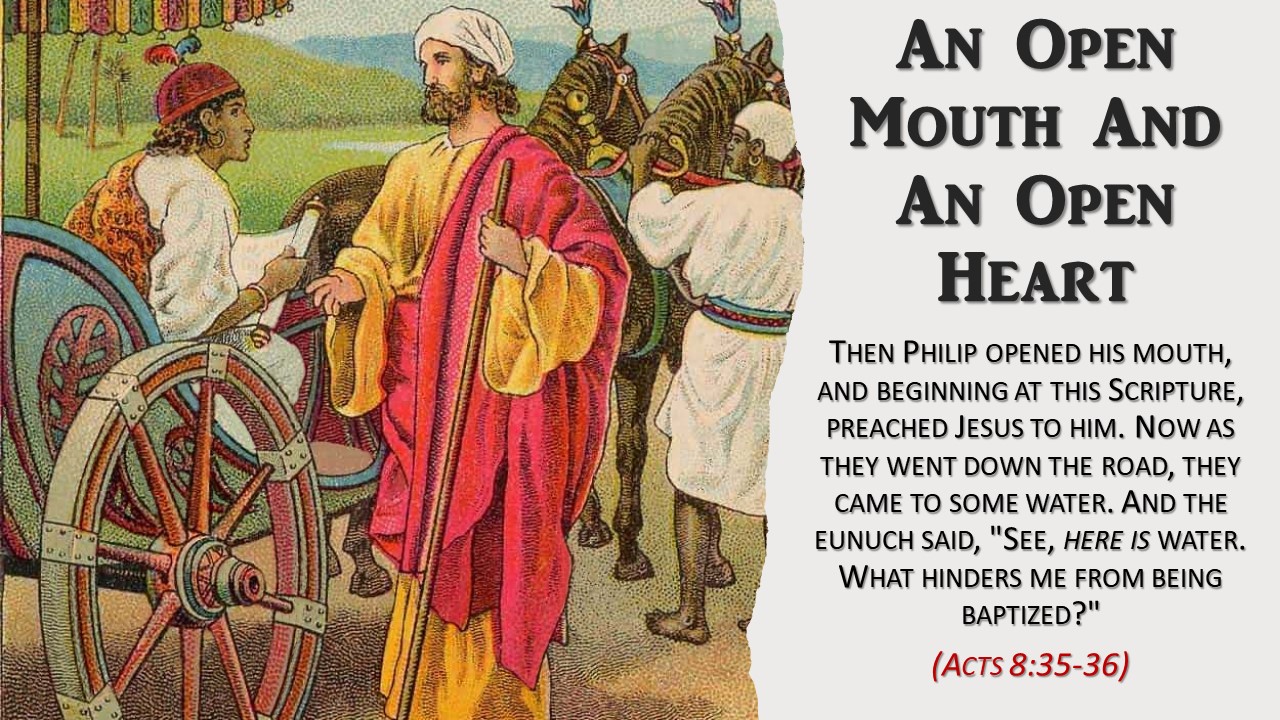 Through the grace of God, an open heart will be receptive to the word of God. There could have many arguments the Ethiopian could have used to dissuade the teaching of Phillip about the Christ. It was the open heart of the man from Ethiopia to accept that he was the subject of Isaiah. In the story of Jesus, Phillip told the Ethiopian that he must be born again in the waters of baptism. The man from Ethiopia embraced the necessity of baptism without reservation. He commanded the chariot to stand still, and he wanted Phillip to baptize him immediately. The Ethiopian went on his way rejoicing because he was a Christian, bound to Christ through the waters of baptism. An open mouth taught an open heart, and that is where stories of conversion come from. Thank God for open mouths and open hearts.