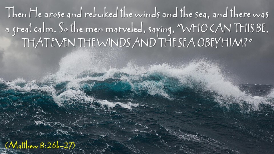 Now when He got into a boat, His disciples followed Him. And suddenly a great tempest arose on the sea so that the boat was covered with the waves. But He was asleep. Then His disciples came to Him and awoke Him, saying, “Lord, save us! We are perishing!” But He said to them, “Why are you fearful, O you of little faith?” Then He arose and rebuked the winds and the sea, and there was a great calm. So the men marveled, saying, “Who can this be, that even the winds and the sea obey Him?” (Matthew 8:23-27)