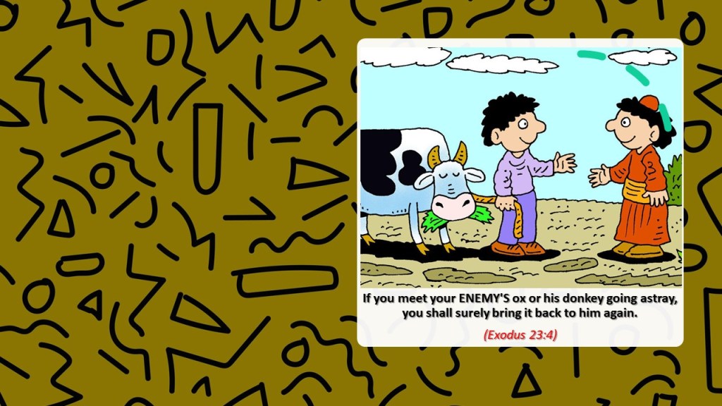 If you meet your enemy’s ox or his donkey going astray, you shall surely bring it back to him again. If you see the donkey of one who hates you lying under its burden, and you would refrain from helping it, you shall surely help him with it. (Exodus 23:4-5)