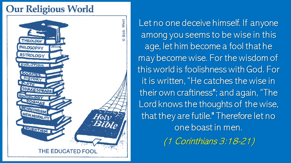 Let no one deceive himself. If anyone among you seems to be wise in this age, let him become a fool that he may become wise. For the wisdom of this world is foolishness with God. For it is written, “He catches the wise in their own craftiness”; and again, “The Lord knows the thoughts of the wise, that they are futile.” Therefore let no one boast in men. (1 Corinthians 3:18-21)