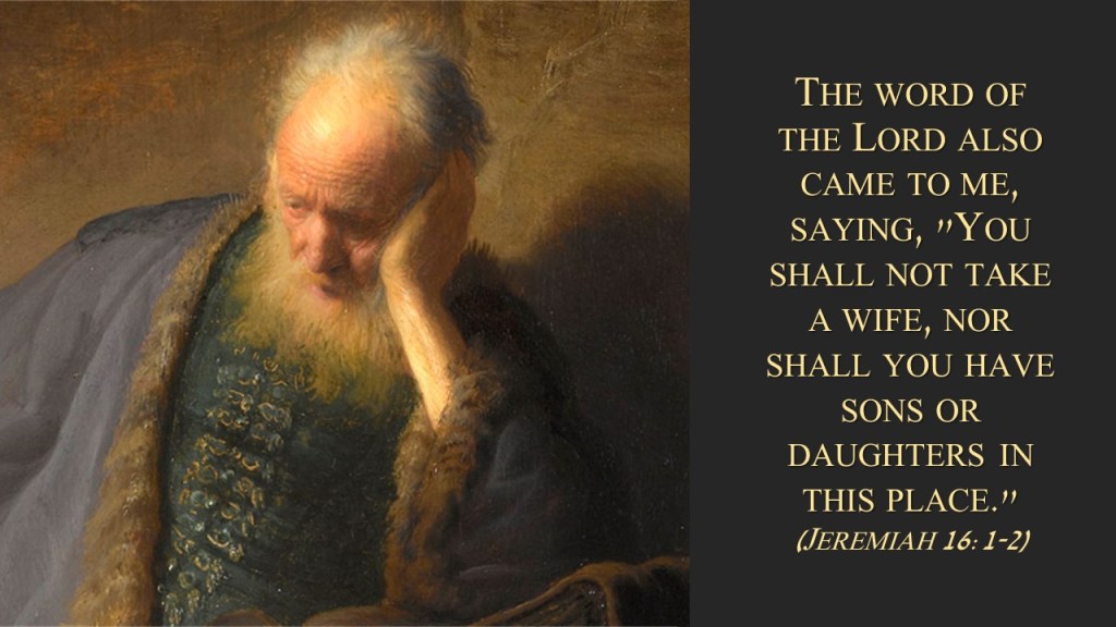 God does not forbid anyone from marrying but the prophet Jeremiah remains a powerful illustration of the judgment of the Lord upon unrighteous nations and ungodly people. Those who deny the reality of perdition do not understand the parable of Jeremiah. Judgment is real against those who forsake the Lord. As the Lord cast out His own people from the land, the righteousness of God will cast out those who serve the gods of this world. Sin damns a soul and the promise of God is real. Jeremiah was forbidden to marry to tell a lesson still relevant to modern man.