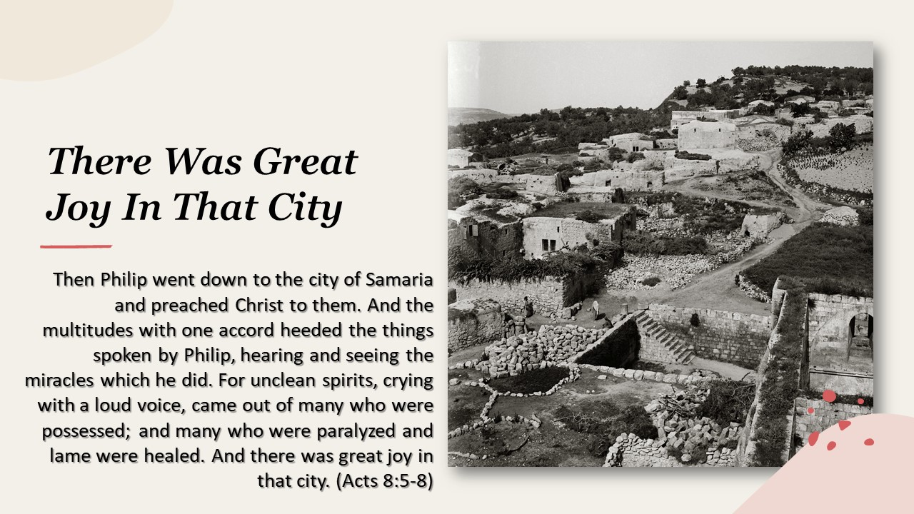 The city of Samaria was first established by Omri, king of Israel, during the days of the divided kingdom. It became the capital of the northern ten tribes and the central place of idolatrous worship under the influence of Ahab and Jezebel. Herod would fortify the city and call it Sebaste. When the persecution of the early church took a toll on the saints, many left Jerusalem. They went into the regions of Judea and Samaria (regional), preaching and teaching the gospel of Christ. Philip, the evangelist, traveled to the city of Samaria (35 miles north of Jerusalem) and preached Christ to them. The apostles had laid hands on Philip and six other men to minister to the needs of the widows in Jerusalem. Arriving at Samaria, Philip confirmed the word of Christ through the miraculous power of the Holy Spirit, casting out unclean spirits, healing those who were paralyzed or lame. The city filled with joy as the multitudes listened closely to the preaching of Philip, eager to know about the Christ. It was a time of revival in the city of Samaria.