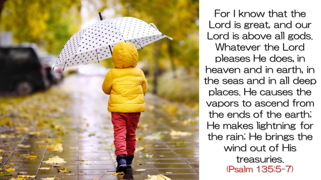 For I know that the Lord is great, and our Lord is above all gods. Whatever the Lord pleases He does, in heaven and in earth, in the seas and in all deep places. He causes the vapors to ascend from the ends of the earth; He makes lightning for the rain; He brings the wind out of His treasuries. (Psalm 135:5-7)