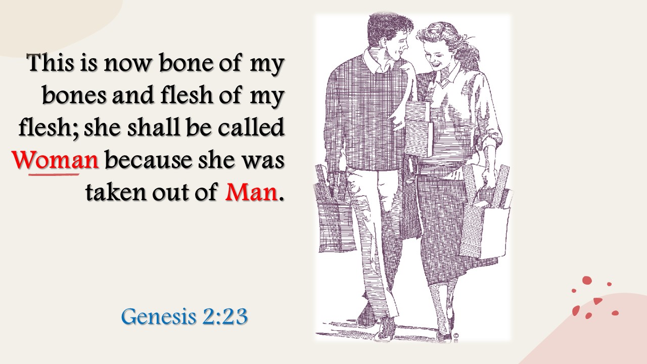 Then the rib which the Lord God had taken from man He made into a woman, and He brought her to the man. And Adam said: “This is now bone of my bones and flesh of my flesh; she shall be called Woman because she was taken out of Man.” Therefore a man shall leave his father and mother and be joined to his wife, and they shall become one flesh. And they were both naked, the man and his wife, and were not ashamed. (Genesis 2:22-25)