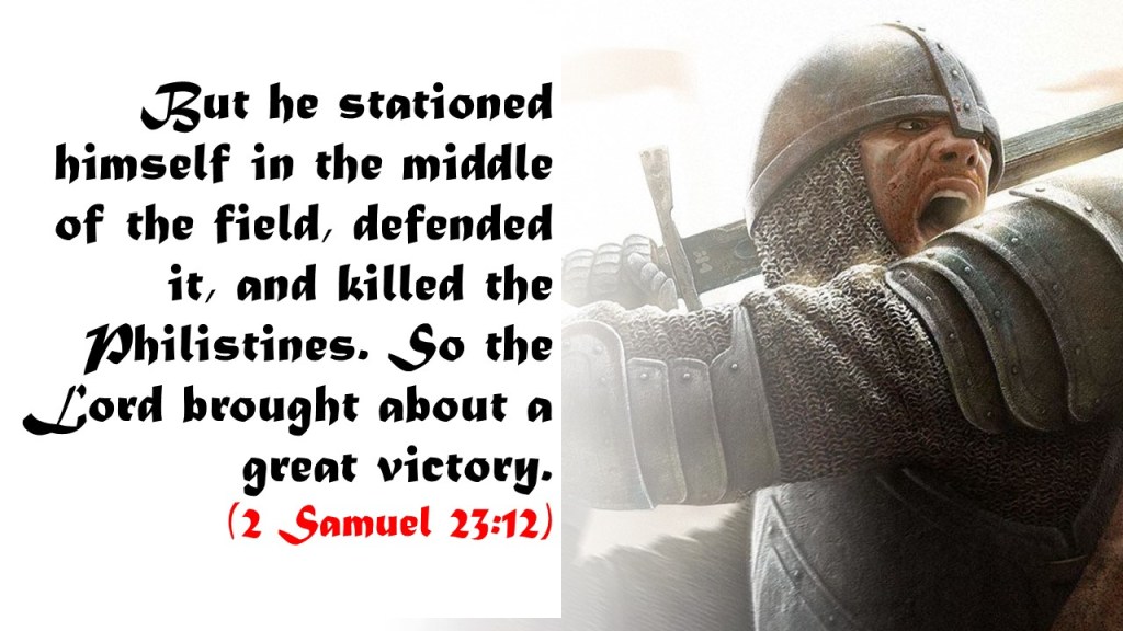 These are the names of the mighty men whom David had: Josheb-Basshebeth the Tachmonite, chief among the captains. He was called Adino the Eznite, because he had killed eight hundred men at one time. And after him was Eleazar the son of Dodo, the Ahohite, one of the three mighty men with David when they defied the Philistines who were gathered there for battle, and the men of Israel had retreated. He arose and attacked the Philistines until his hand was weary, and his hand stuck to the sword. The Lord brought about a great victory that day; and the people returned after him only to plunder. And after him was Shammah the son of Agee the Hararite. The Philistines had gathered together into a troop where there was a piece of ground full of lentils. So the people fled from the Philistines. But he stationed himself in the middle of the field, defended it, and killed the Philistines. So the Lord brought about a great victory. (2 Samuel 23:8-12)