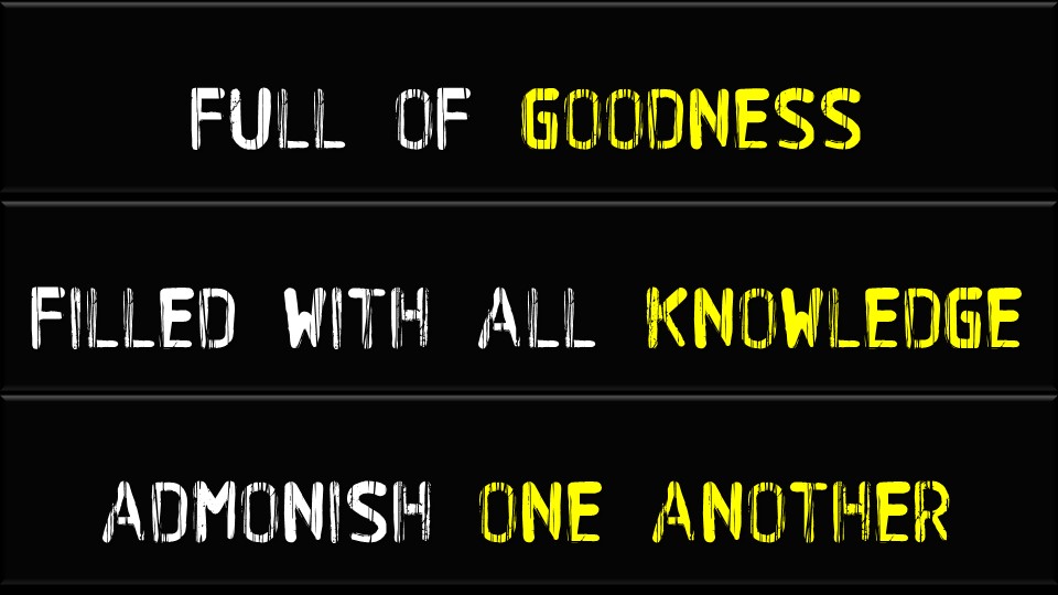 Paul uses three admonitions to strengthen the faith of the Christians. He knew they were full of goodness. The saints in Rome were kind, benevolent, and ready to do the work of the Lord with love. There was a spirit of unity in the Roman church because of the goodness they had for one another and their concern for others. The gospel spread to the household of Caesar as a direct result of the goodness of the Roman brethren. Paul does not commend the brethren because of their goodness but how full they were to show goodness to all men. The world is dark and foreboding, with little kindness and goodness shown to one another. One of the hallmarks of the Christian faith is the goodness that fills the hearts of its people. The world needs to see a congregation filled with love, goodness, benevolence, and concern. Individual Christians in a community can do much to bring people to Christ when they show goodness at the workplace, in stores, in the neighborhood, and in family life.