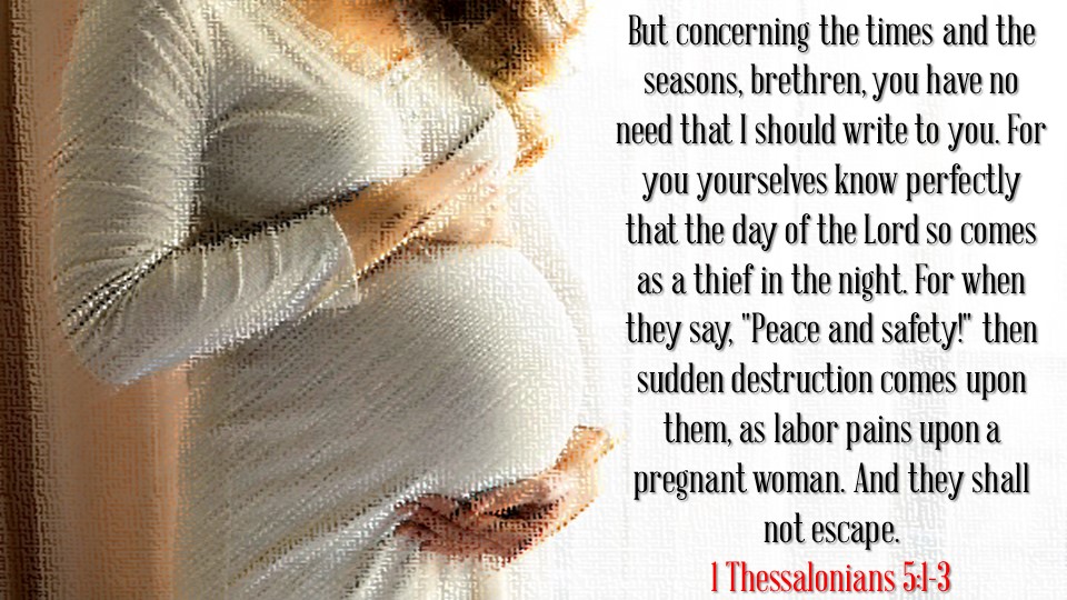 But concerning the times and the seasons, brethren, you have no need that I should write to you. For you yourselves know perfectly that the day of the Lord so comes as a thief in the night. For when they say, “Peace and safety!” then sudden destruction comes upon them, as labor pains upon a pregnant woman. And they shall not escape. (1 Thessalonians 5:1-3)