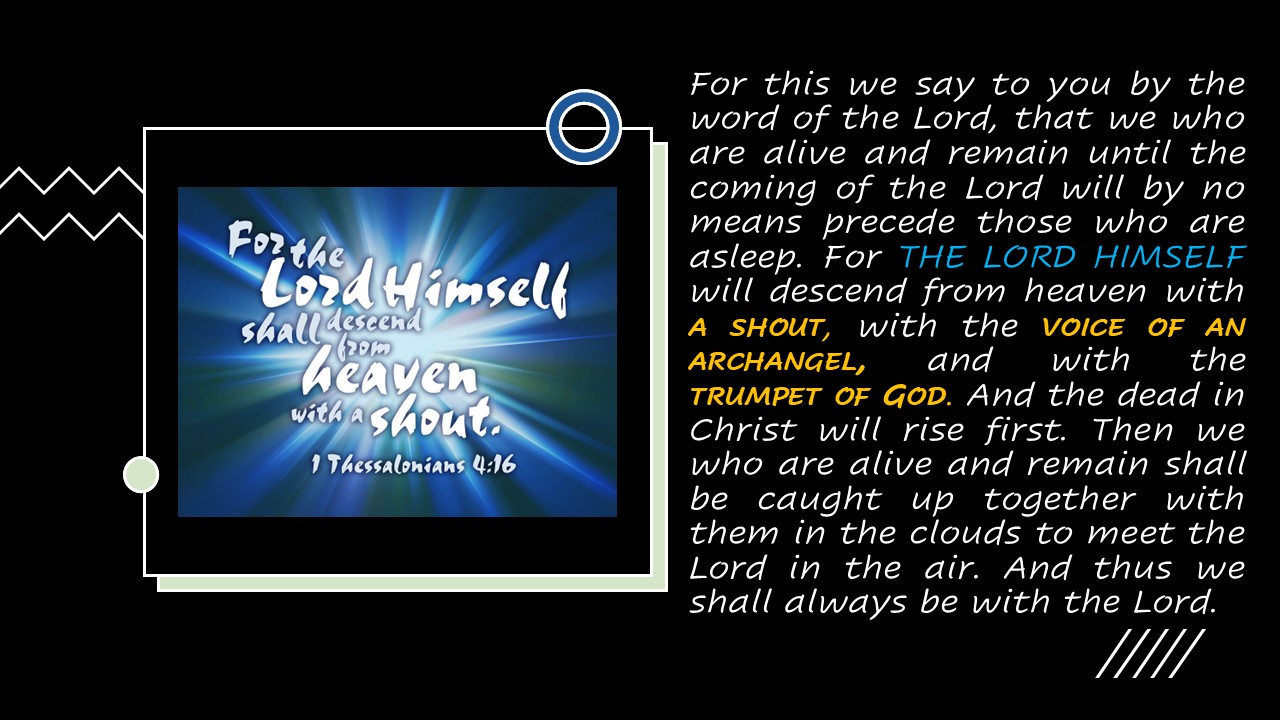 For this we say to you by the word of the Lord, that we who are alive and remain until the coming of the Lord will by no means precede those who are asleep. For the Lord Himself will descend from heaven with a shout, with the voice of an archangel, and with the trumpet of God. And the dead in Christ will rise first. Then we who are alive and remain shall be caught up together with them in the clouds to meet the Lord in the air. And thus we shall always be with the Lord. (1 Thessalonians 4:15-17)