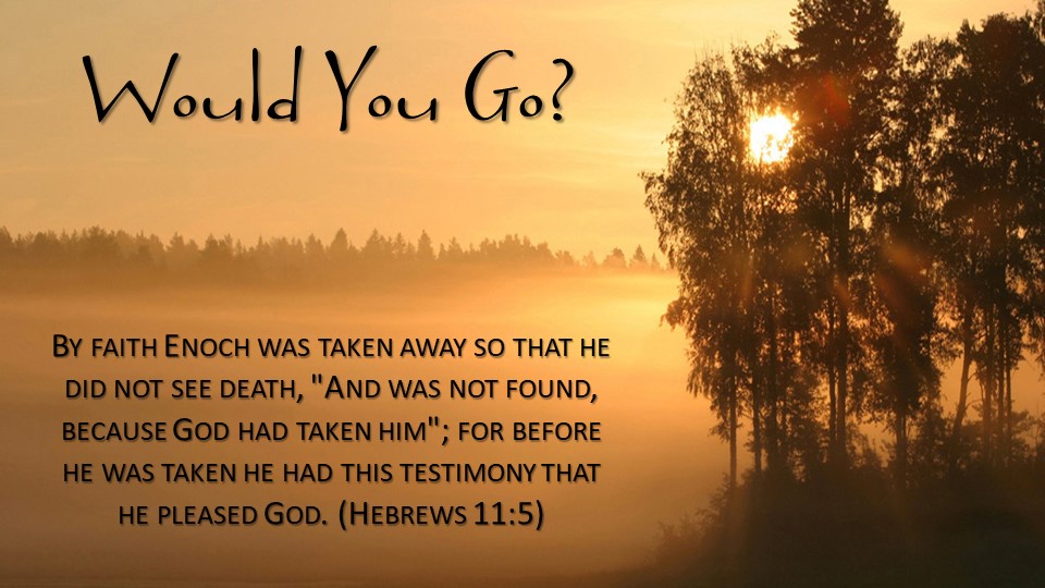 In the book of Hebrews, Paul exhorts the struggling Christians to keep their faith, using many examples of men and women who faced uncertainty but retained their faith in God. Enoch was mentioned as one who did not see death because God had taken him. The Holy Spirit reveals the only insight into the decision of taking Enoch when He says that Enoch had a testimony that he pleased God. Jude will write that Enoch was a prophet who spoke against the ungodly of his day. Following these two references, the scriptures fall silent. But there is one question that begs an answer: would you be willing to leave and go with God?