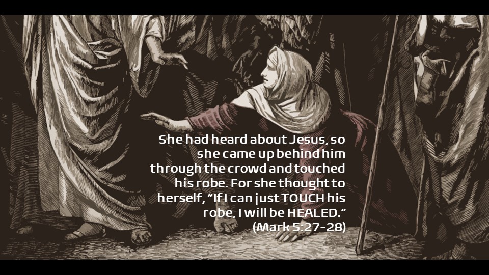 Now a woman, having a flow of blood for twelve years, who had spent all her livelihood on physicians and could not be healed by any, came from behind and touched the border of His garment. And immediately her flow of blood stopped. And Jesus said, “Who touched Me?” When all denied it, Peter and those with him said, “Master, the multitudes throng and press You, and You say, ‘Who touched Me?’ ” But Jesus said, “Somebody touched Me, for I perceived power going out from Me.” (Luke 8:43-46)