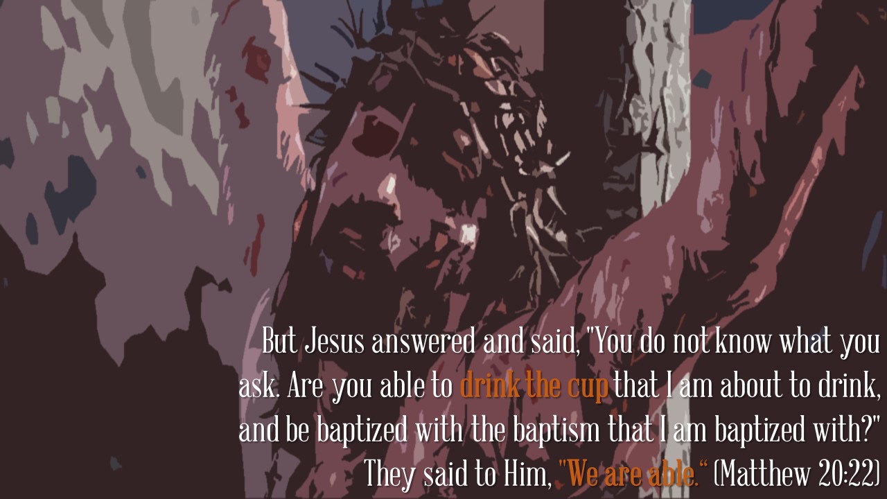 Then the mother of Zebedee’s sons came to Him with her sons, kneeling down and asking something from Him. And He said to her, “What do you wish?” She said to Him, “Grant that these two sons of mine may sit, one on Your right hand and the other on the left, in Your kingdom.” But Jesus answered and said, “You do not know what you ask. Are you able to drink the cup that I am about to drink, and be baptized with the baptism that I am baptized with?” They said to Him, “We are able.” (Matthew 20:20-22)