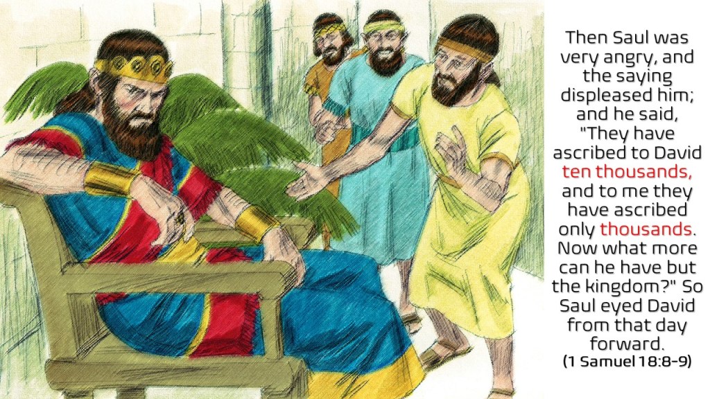 Then Saul was very angry, and the saying displeased him; and he said, “They have ascribed to David ten thousands, and to me they have ascribed only thousands. Now what more can he have but the kingdom?” So Saul eyed David from that day forward. (1 Samuel 18:8-9)
