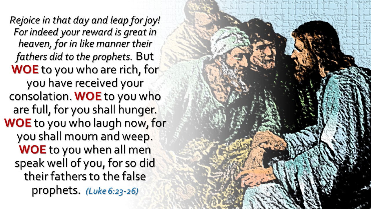 Rejoice in that day and leap for joy! For indeed your reward is great in heaven, For in like manner their fathers did to the prophets. “But woe to you who are rich, For you have received your consolation. Woe to you who are full, For you shall hunger. Woe to you who laugh now, For you shall mourn and weep. Woe to you when all men speak well of you, For so did their fathers to the false prophets. (Luke 6:23-26)