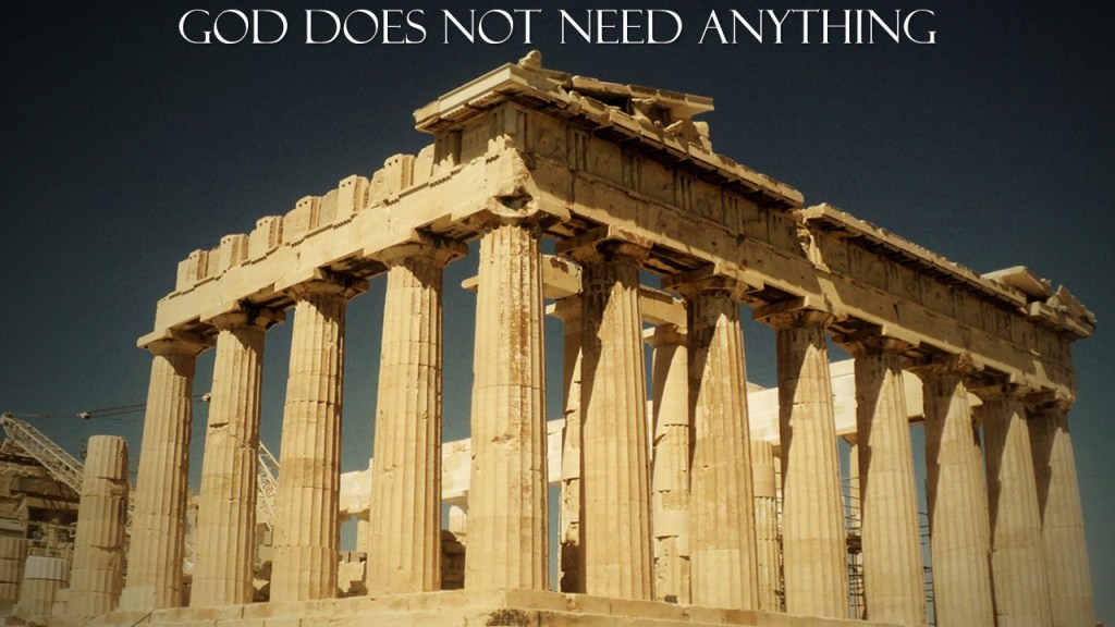 All the wealth of Athens paraded itself before Paul. Temples were ornate with the fineries of human pomp and circumstance, but Paul was not impressed. He told the Athenians that the one true God is not worshiped in the temples of men as if God needed those temples. Nothing man can create will satisfy the worship of the Lord God. In fact, God has no need for anything from a man because He is independent of men. All men need life, breath, and everything to sustain their existence. Life is in the blood, and without the blood, man will die. Oxygen is required for the human body. Food nourishes the body. Everything about the human equation demands the existence of a life force.
