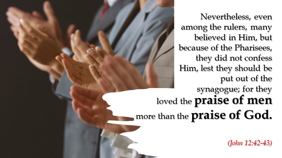 Nevertheless, even among the rulers, many believed in Him, but because of the Pharisees, they did not confess Him, lest they should be put out of the synagogue; for they loved the praise of men more than the praise of God. (John 12:42-43)