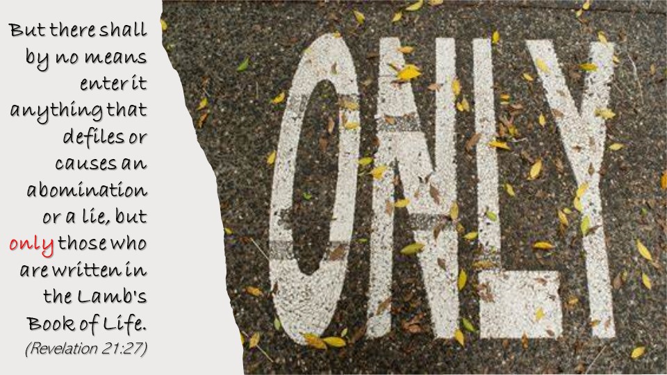 But there shall by no means enter it anything that defiles or causes an abomination or a lie, but only those who are written in the Lamb’s Book of Life. (Revelation 21:27)