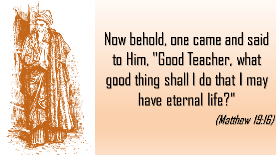 Now behold, one came and said to Him, “Good Teacher, what good thing shall I do that I may have eternal life?” So He said to him, “Why do you call Me good? No one is good but One, that is, God. But if you want to enter into life, keep the commandments.” He said to Him, “Which ones?” Jesus said, ” ‘You shall not murder,’ ‘You shall not commit adultery,’ ‘You shall not steal,’ ‘You shall not bear false witness,’ ‘Honor your father and your mother,’ and, ‘You shall love your neighbor as yourself.’ ” (Matthew 19:16-19)