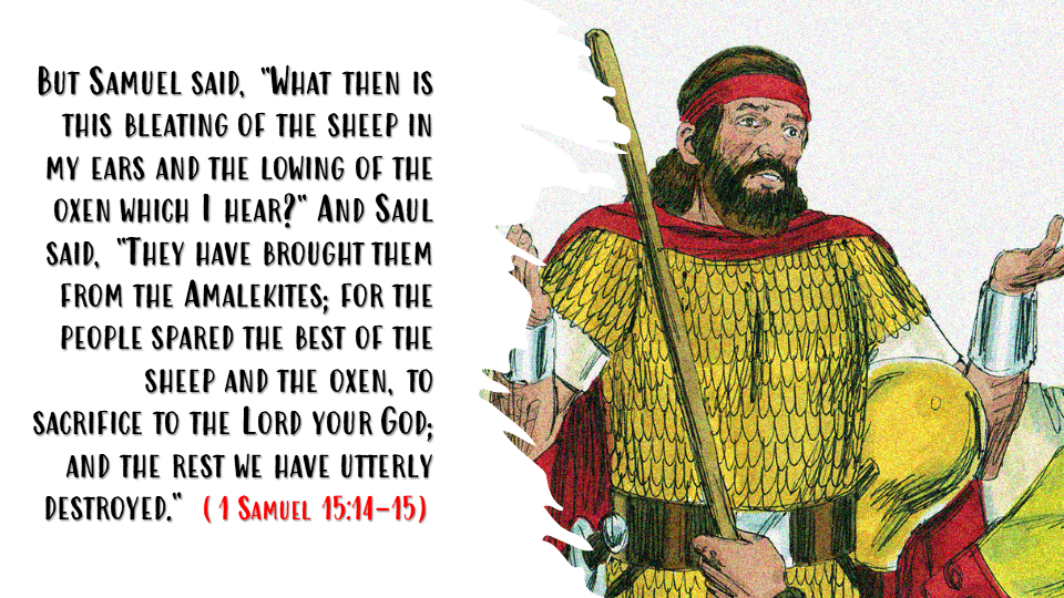 But Samuel said, “What then is this bleating of the sheep in my ears and the lowing of the oxen which I hear?” And Saul said, “They have brought them from the Amalekites; for the people spared the best of the sheep and the oxen, to sacrifice to the Lord your God; and the rest we have utterly destroyed.” (1 Samuel 15:14-15)