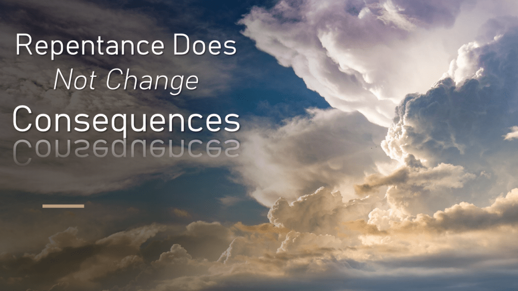 The law of sowing and reaping is an absolute law often ignored. Sin will bring consequences both in the eyes of the Lord and the affairs of man. A man can rebel against the word of the Lord and be forgiven, but this may not remove the consequences of what he has done. If a man commits murder, he can be forgiven, but that does not mean he will not pay the civil penalty of either prison or death. Sexual immorality can be forgiven, and the body still suffers from the disease of the act. There is nothing that suggests repentance can and will remove the consequence.