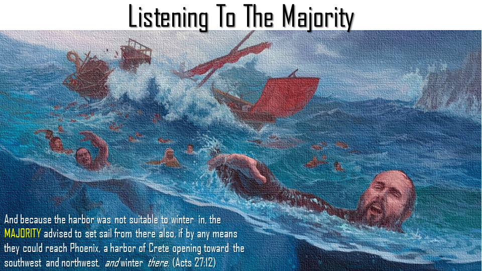 Salvation is an individual choice, not measured by the decisions of the masses. The influence of the majority can sway the hearts of the individual, but ultimately, eternal life will be granted to each individual based upon the choices made by the individual, not the majority. Following what the majority says is seldom a wise choice. Going with the flow or following the path of least resistance is a dangerous path to walk. Following the majority is remaining silent when a word of caution should be said. If the people traveling with Paul had listened to his counsel from the word of the Lord, the journey would have turned out differently.