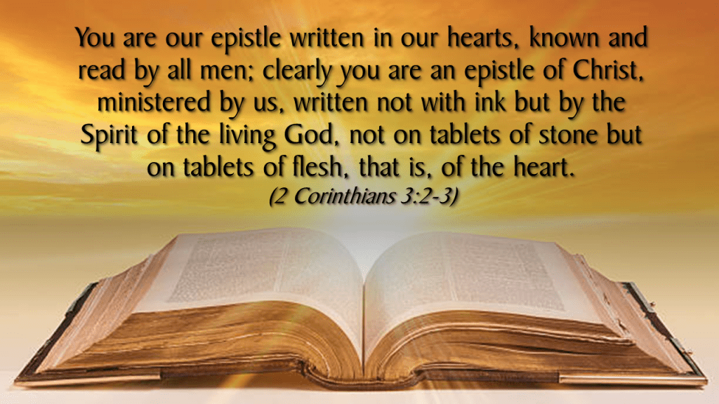 You are our epistle written in our hearts, known and read by all men; clearly you are an epistle of Christ, ministered by us, written not with ink but by the Spirit of the living God, not on tablets of stone but on tablets of flesh, that is, of the heart. (2 Corinthians 3:2-3)