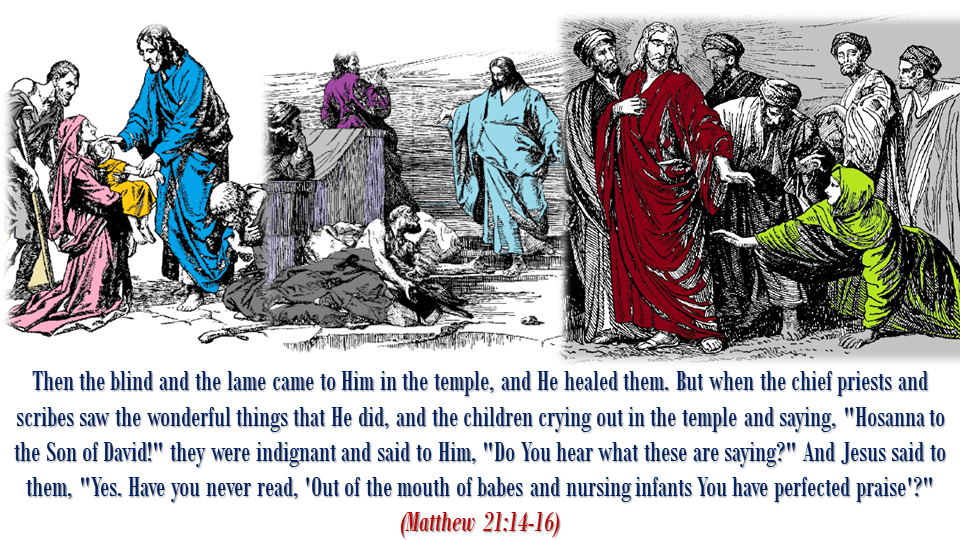 Then the blind and the lame came to Him in the temple, and He healed them. But when the chief priests and scribes saw the wonderful things that He did, and the children crying out in the temple and saying, “Hosanna to the Son of David!” they were indignant and said to Him, “Do You hear what these are saying?” And Jesus said to them, “Yes. Have you never read, ‘Out of the mouth of babes and nursing infants You have perfected praise’?” (Matthew 21:14-16)