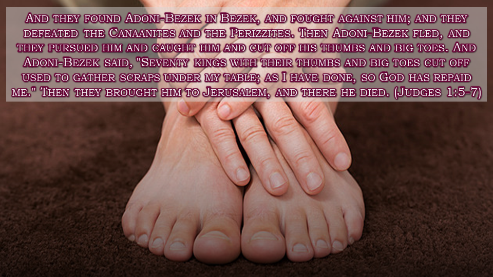 And they found Adoni-Bezek in Bezek, and fought against him; and they defeated the Canaanites and the Perizzites. Then Adoni-Bezek fled, and they pursued him and caught him and cut off his thumbs and big toes. And Adoni-Bezek said, “Seventy kings with their thumbs and big toes cut off used to gather scraps under my table; as I have done, so God has repaid me.” Then they brought him to Jerusalem, and there he died. (Judges 1:5-7)