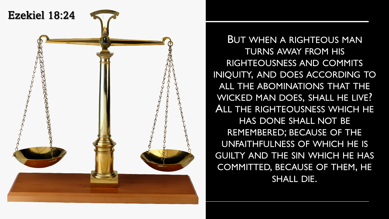 But when a righteous man turns away from his righteousness and commits iniquity, and does according to all the abominations that the wicked man does, shall he live? All the righteousness which he has done shall not be remembered; because of the unfaithfulness of which he is guilty and the sin which he has committed, because of them, he shall die. (Ezekiel 18:24)