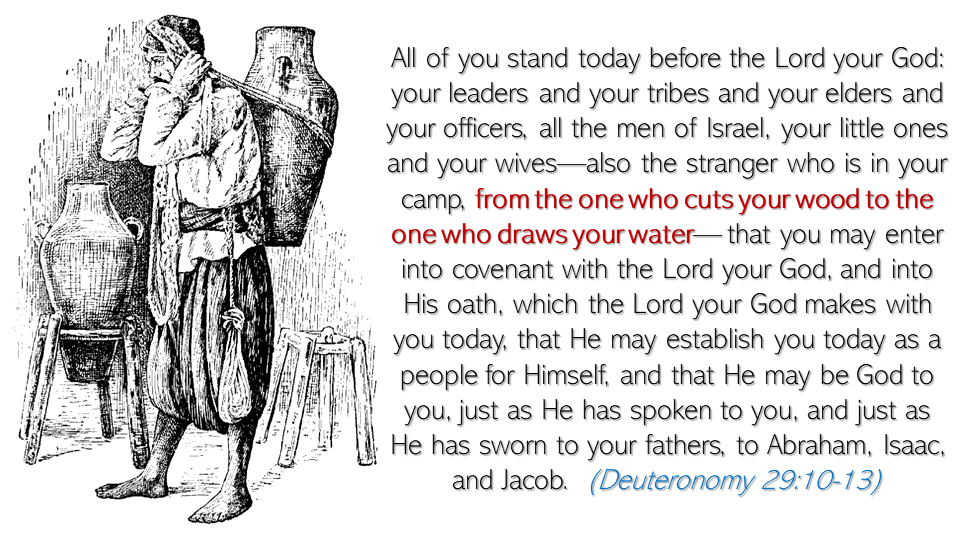 Slaves were common in Israel, but they were not to be forgotten. There were those whose job was cutting wood and gathering water. These were not overlooked in the covenant God made with Israel. They were not the important, prestigious men of leadership, but God included them in the salvation of Israel. Moses was reminding all of Israel that everyone was important. No one should be left out in the work of the nation, and salvation is found in the covenant with God.