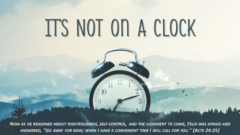 The ticking of the clock should remind those seeking a convenient time that life is short and that today is the day of salvation. Many people who believe they will die at the midnight hour face death at 11:30. It comes suddenly, swiftly, and without warning. The sad reality of the convenient time is that most people die unprepared. There is no convenient time later; it is only now. Felix would have regretted his lost opportunity to serve Christ. When he died, he realized time was over.