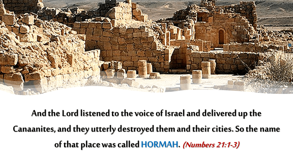 The king of Arad, the Canaanite, who dwelt in the South, heard that Israel was coming on the road to Atharim. Then he fought against Israel and took some of them prisoners. So Israel made a vow to the Lord, and said, “If You will indeed deliver this people into my hand, then I will utterly destroy their cities.” And the Lord listened to the voice of Israel and delivered up the Canaanites, and they utterly destroyed them and their cities. So the name of that place was called Hormah. (Numbers 21:1-3)