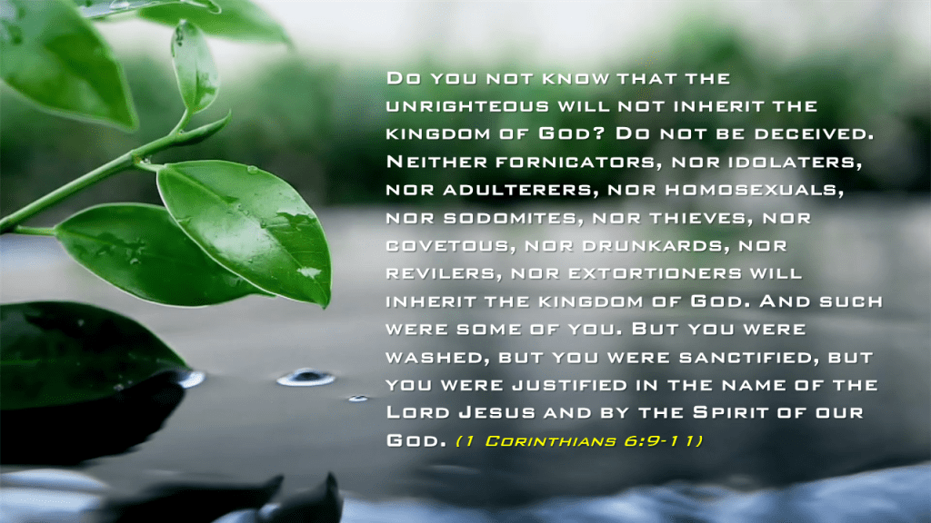 Do you not know that the unrighteous will not inherit the kingdom of God? Do not be deceived. Neither fornicators, nor idolaters, nor adulterers, nor homosexuals, nor sodomites, nor thieves, nor covetous, nor drunkards, nor revilers, nor extortioners will inherit the kingdom of God. And such were some of you. But you were washed, but you were sanctified, but you were justified in the name of the Lord Jesus and by the Spirit of our God. (1 Corinthians 6:9-11)