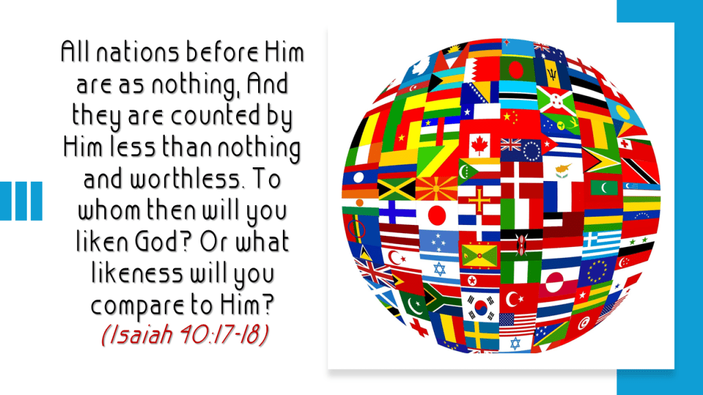All nations before Him are as nothing, and they are counted by Him less than nothing and worthless. To whom then will you liken God? Or what likeness will you compare to Him? (Isaiah 40:17-18)