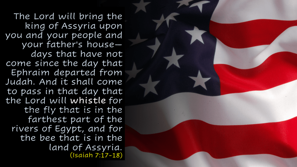 The Lord will bring the king of Assyria upon you and your people and your father’s house—days that have not come since the day that Ephraim departed from Judah. And it shall come to pass in that day that the Lord will whistle for the fly that is in the farthest part of the rivers of Egypt, and for the bee that is in the land of Assyria. (Isaiah 7:17-18)