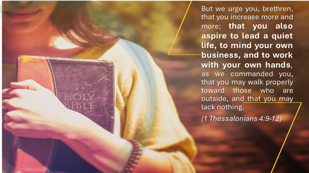 The Bible is filled with many warnings of keeping the law and obeying the word of the Lord. There are many parts of scripture where the doctrines of God are emphasized for their eternal consequences, demanding faithfulness on the part of God’s people. One part of scripture often overlooked is telling His people to live quiet lives as good examples to the world. Paul reminds the saints in Thessalonica to love one another and to lead quiet lives. The Christian does not show the world a loud character of rebellion, chaos, or civil unrest. God expects His people to submit to government with reverence and fear. The example of the saint is one of quietness and holiness. There is a part of the Christian’s life where they work diligently with their hands to provide for those in need and to mind their own business as examples of truth and righteousness.